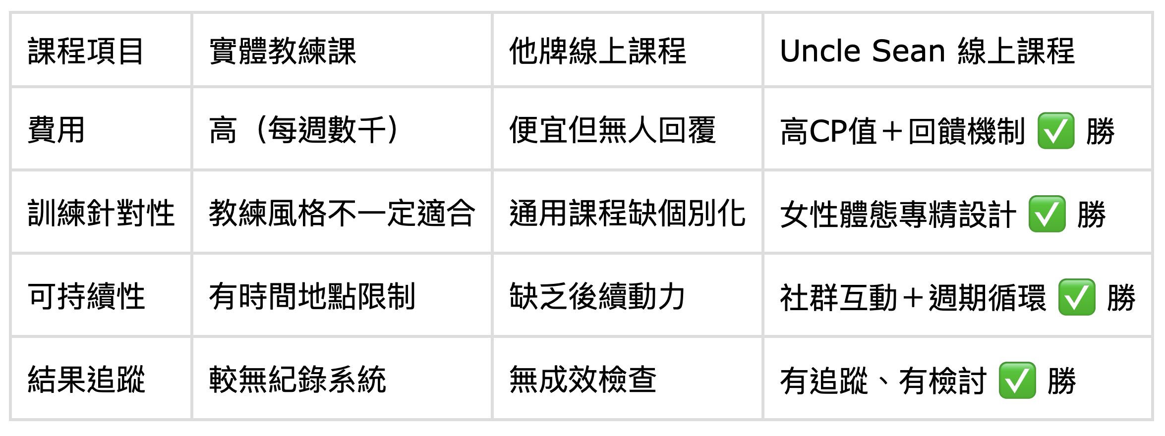 - Uncle Sean 給你的是:週期化課表、動作教學影⽚、訓練進度回報機制、社群陪跑與Q&A ⽀援,完整養成。